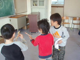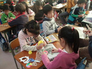 2年生は一生懸命教えて、それを聞いている1年生も真剣です。写真からもその楽しい雰囲気が伝わると思います。これまでも1・2年生が合同で様々な活動をしてきました。本校には1年から6年までが一緒に活動する「希望っ子班」がありますが、このように隣接学年との活動も盛んで、効果をあげています。
