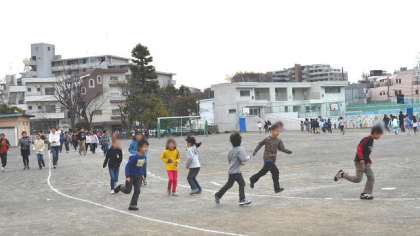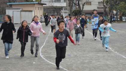今週は持久走週間で、中休みに音楽に合わせて5分間持久走をします。14日(月)今日はその初日。さっそく休み時間に子どもたちが校庭に出て走りました。