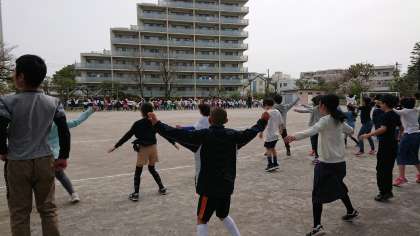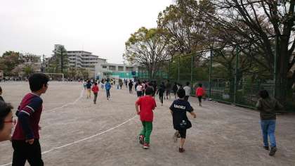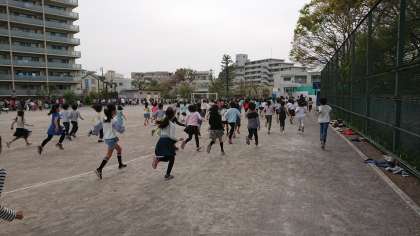 毎週水曜の朝はスポーツタイムです。最初は五分間走に取り組みます。五分間、トラックを走ります。走った周回数分マラソンカードに記録をします。4枚目345周走ると山手線一周と同じ距離になります。