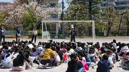 4月の避難訓練の様子です。今回は学校の北側の民家が火事になったという想定のもと、避難訓練を行いました。基本的な避難経路の確認をしました。