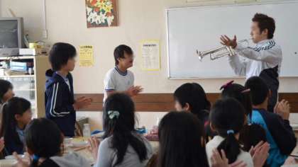 15日、給食の時間にランチルームからトランペットの音がしてきました。何だろうと思い出かけてみたところ・・・。担任が誕生日をお祝いしてトランペットで「ハッピーバースデイ」の曲を演奏しているところでした。祝福されている二人もうれしそう。みんなも惜しみない拍手を贈っていました。いつもの恒例行事だそうです。いいですね。