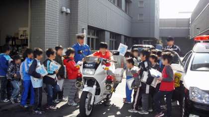 説明の後、警察署の屋上に出て、近隣の風景を見ました。この日はとても暖かく気持ちのよい天候でしたので、遠くまで見渡せて気持ちがよかったです。そして白バイとパトカーの見学。説明の後、実際に乗せていただいたり、中を見せていただき子どもたちは大感激でした。成城警察署の皆様、お忙しいところありがとうございました。