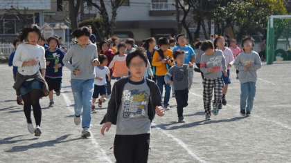 今週は持久走週間でしたが、25日(金)の中休みはその取り組みの最終回でした。音楽に合わせて5分間、元気に持久走に取り組みました。インフルエンザや発熱で休んでいる児童が増えていますので、体調の悪い子は見学にしました。