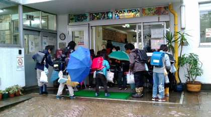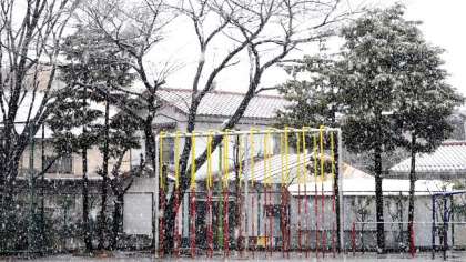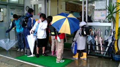 7日(月)の登校の様子です。降りしきる冷たい雨の中子どもたちが登校してきます。感心なことに、玄関に入る前にどの子も入り口で傘のしずくを落とす習慣がついています。登校前に、毎朝玄関ホールを掃き清め、子どもたちを迎え入れる準備をしている学校主事の気持ちに、子どもたちが雨のしずくで汚さないようにという礼儀が身についていることは、希望丘小学校の自慢です。その後天気は雨から雪に変わり、少しずつつもり始めています。