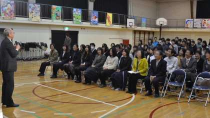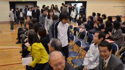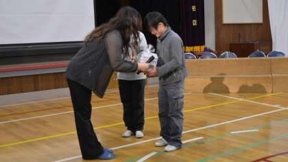 7日(月)午後、6年生児童と保護者、本校職員とお招きした旧職員が体育館に集まって「感謝の会」を行いました。来賓と職員が拍手で迎えられ入場。はじめはセレモニーです。来賓のお話を伺い、PTAからの記念品贈呈を行いました。セレモニーの司会は6年生の3人が行い、さすが希望っ子の伝統で、原稿を見ずに堂々と進行することができました。