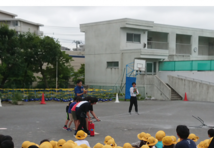 5・6年生代表児童が、実際に消火器を使って実習を行いました。見ている全校児童は大きな声で「火事だー!」と叫び、代表児童は上手にに消火を行うことができました。