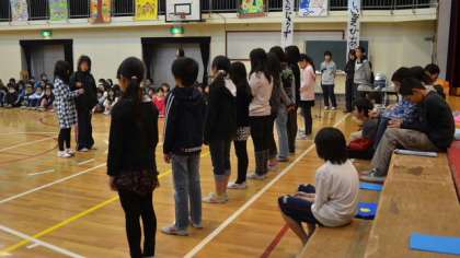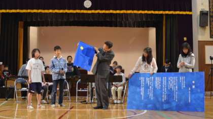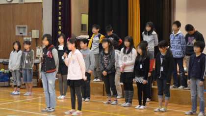 次のプログラムは「希望っ子班」の引き継ぎです。6年生11人の班長さんが引き継ぐにあたっての言葉を述べ、それを受けて5年生代表が決意を語りました。どちらも堂々として立派でした。後はしっかり5年生にまかせることができそうです。続いて6年生から在校生への贈りものが披露されました。