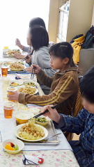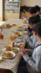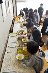 バイキング給食の幸せそうな食事風景です。子どもたちのすてきなところは、最初の盛りつけの時に、好きな物を好きなだけとらずに、あとの子のことを考えて適量にとどめていたことです。他の学年の子どもたちがあこがれるバイキング給食です。