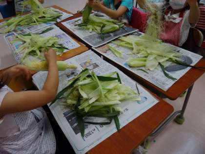 今日は、1年生のみんなに「とうもろこしの皮むき」の