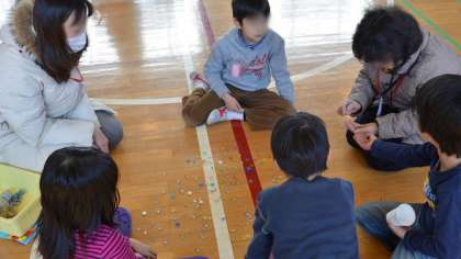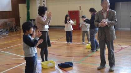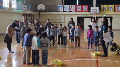1年生がふれあい給食会を開きました。これは、1年生の祖父母、地域で日頃からお世話になっている方をご招待し、1年生が一緒に給食を食べて、人と人との心のふれあいを経験するという目的で行っています。給食に先だって、体育館で昔遊びを一緒にしていただきました。剣玉やコマ回し、お手玉、おはじきなど、お集まりいただいた方には昔とった杵柄を披露していただいて、子どもたちは大はしゃぎでした。