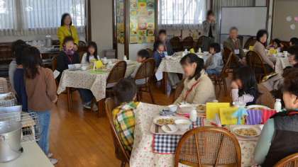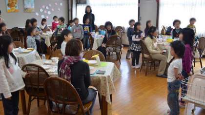 楽しい遊びのひとときをすごし、いよいよ給食です。会場をランチルームに移し、グループごとにお客様に座っていただき、会食をしました。お集まりいただいた皆さんが、一生懸命子どもたちから話を引き出してくださり、楽しい会食になったこと、とてもありがたく思いました。子どもたちにとって貴重な体験となりました。最後にお礼の気持ちをこめて「校歌」を1年生が歌ってお開きとしました。ありがとうございました。