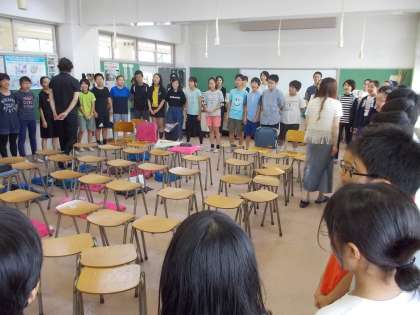 17日(水)に劇団四季の俳優さんをお招きして「美しい日本語の話し方教室」を行いました。相手に伝わる話し方のポイントを俳優さんの視点から教えていただきました。プロの俳優さんの美しい声が教室中に響き、そこに子どもたちの歌声も重なって、とてもよい時間になりました。