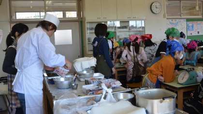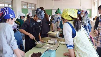 11日3・4時間目、5年生が本職の和菓子職人さんをゲストティーチャーにお招きして、おまんじゅうづくりをしました。このおまんじゅうは、5年生が心をこめて作り、お世話になった6年生に贈るものです。近年恒例となっています。