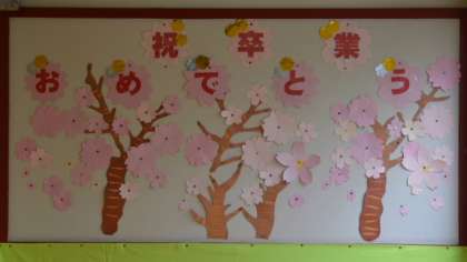 そのようなつらいニュースが続く今日この頃ですが、春は間近にせまっています。校舎北側、道路に面した桜の木の蕾を、3階の窓から撮影しました。15日、今日は昨日の暖かさから一転して曇り空の寒い一日になりましたが、桜の蕾はこんなにふくらんでいます。そして、ひと足先に校内の掲示板には桜の花が咲きました。卒業式に向けて掲示板も模様替え。卒業モードになりました。校長:千葉