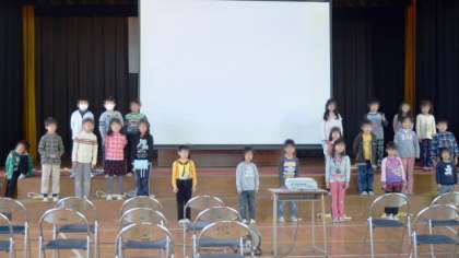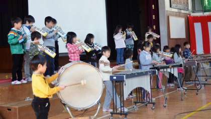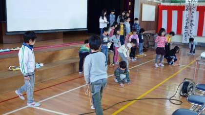 17日、高学年が卒業式の練習にがんばっているところですが、1年生も負けていません。体育館で入学式の後に行う、新入生歓迎のアトラクションの練習をしました。内容は当日までのお楽しみ。写真で少しだけようすを伝えます。元気いっぱいの1年生。もうりっぱな2年生の雰囲気です。