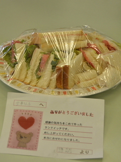 できあがったサンドイッチは、さっそく職員室や主事室に持って行き、心をこめたカードのメッセージとともに直接手渡しました。6年生のやさしい気持ちが伝わってくる、とてもおいしいサンドイッチでした。ありがとう!