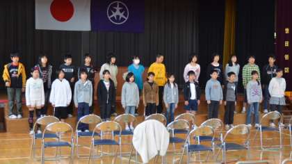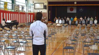 23日、明日はいよいよ修了式。その後卒業式のリハーサルがあります。今日は6年生が単独で行う最後の卒業式練習となりました。担任が遠くから見守る中、25人の卒業生は寒い体育館でがんばりました。