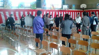 24日午後、卒業式の会場準備を職員全員で行いました。みんな卒業生を粗相なく送り出すために一生懸命です。写真は最後に体育館に集まり、チェックをしているところです。