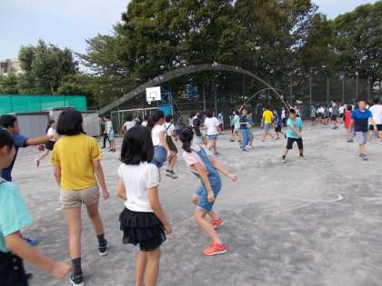 秋晴れの空の下、長なわ跳びに挑戦しました。学級ごとに目標回数を決め、取り組んでいます。時間は3分間です。今回のスポーツタイムでも、学級新記録が出て、歓声が上がりました。