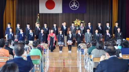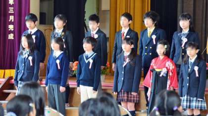 卒業式後半は呼びかけです。卒業生が舞台前に並び、はじめに思い出を語ります。6年間の思いをこめて、はっきりした口調で前を見つめ語る子どもたちは立派でした。