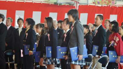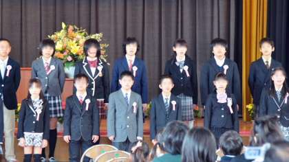 呼びかけの後半は、4・5年生の掛け合いと歌です。後を引き継ぐ4・5年生も元気でしっかりとした語り、歌いました。卒業生の歌詞の意味をかみしめるように歌う姿に、会場では涙も。最後に全員で声高らかに校歌を斉唱しました。