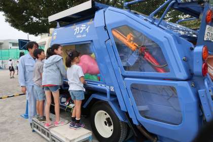清掃車にごみを入れる体験では、ボタン一つでトラックの中に