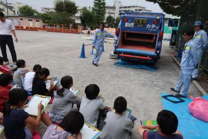 社会「ごみのゆくえ」の学習で、清掃車でのごみ収集の体験を