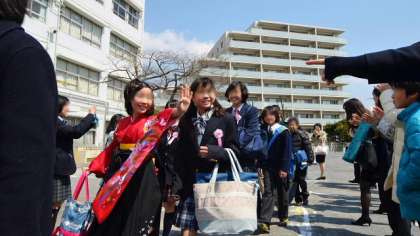 いよいよ学校とのお別れ。4・5年生、保護者・家族、職員が並ぶ校庭で、卒業生を見送りました。今日の天気のように、さわやかですてきな卒業生。いつでも遊びにいらっしゃい、待っていますよ。ご参列いただいた皆さんありがとうございました。