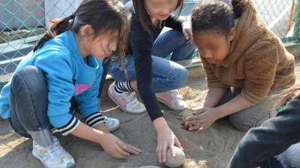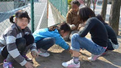 30日の新BOP内学童クラブのようすです。昼過ぎ、やっと春らしくなった暖かい日差しの中で、子どもたちが夢中になって校庭の片隅に・・・近寄ってみると泥団子づくりをしていました。かちんかちんに固めて、砂をまぶして・・・楽しそうです。いつの時代でも子どもたちの定番の遊びは継承されるのですね。