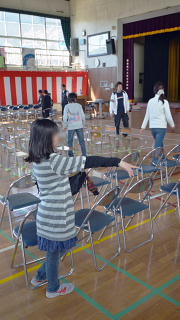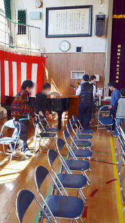 写真は体育館会場準備と入学式児童代表の言葉の練習です。