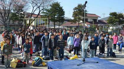 さあ、いよいよ担任の発表です。子どもたちの期待の眼差し。結果は子どもたちが持ち帰った学校だより別冊をご覧ください。最後に音楽教諭の伴奏で校歌を歌い、始業式を閉じました。