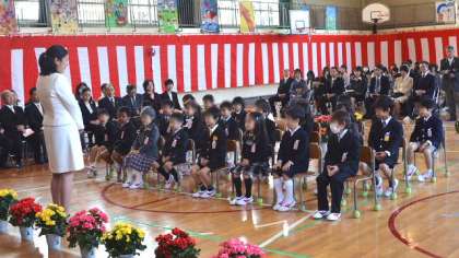 次は担任の紹介です。担任のあいさつに続き、ひとりひとりの児童を呼名(名前を読み上げる)しました、しっかりと手を挙げ返事をして応える新入生。25名全員が合格の花丸をもらいました。続いてPTA会長さんからお祝いの言葉をいただきました。話の聞き方合格です。