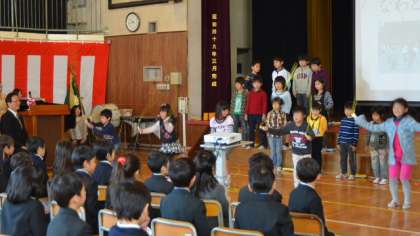次は6年生代表の言葉です。希望丘小学校伝統で原稿を見ずに、2名の代表児童が大きな声でしっかりとした口調で、1年生に学校生活のことを伝えました。続いて、2年生が舞台前に登場。歓迎のアトラクションです。今年度はスクリーンに画像を映し出し、自分たちが今1年間で経験した学校生活を新入生に紹介しました。途中でコマ回しや縄跳びも披露し、新入生にアピールしました。