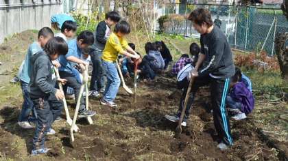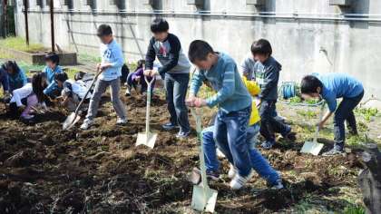 5・6校時に4年生が学級園の畑を耕しました。5時間目は2組、6時間目は1組が担当して、作物を植える準備ができました。スコップやシャベルを使って、担任の先生と一緒に作業する姿は、汗だくになるくらいみんな一生懸命です。