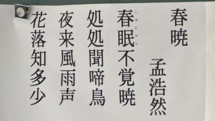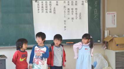 世田谷区立の小中学校は全校で教科「日本語」に取り組んでいます。2年生の様子です。漢詩「春暁」を暗記しグループごとに発表しているようすです。漢詩の意味を教えるわけではなく、声に出して読み上げることによって、言葉のリズムを感じ、情景を想像します。2年生でも、何度か楽しんで読み上げているうちに、あっという間に覚えてしまいます。