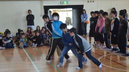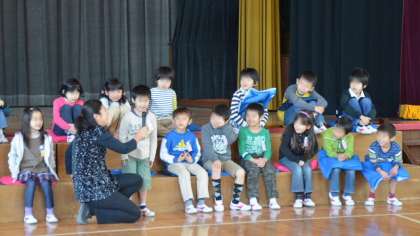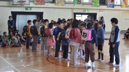 続いて、1年生が一人ひとり自己紹介しました。全校児童の前で話すのには勇気がいると思うのですが、どの子もはっきり大きな声で自分の名前を言うことができました。次は各学年からのメッセージです。各学年の趣向をこらしたメッセージに、1年生も目をまるくしていました。