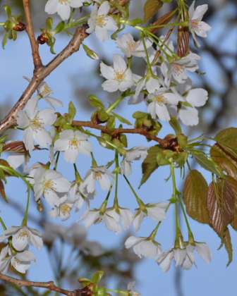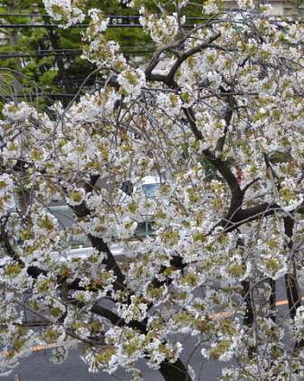 これは「オオシマザクラ」ではないかと思います校舎北側、給食室の近く道路側に咲いており、今がまさに盛りです。ソメイヨシノほど派手ではありませんが、白い花が控えめで、葉も一緒に開いています。ぜひご覧ください。