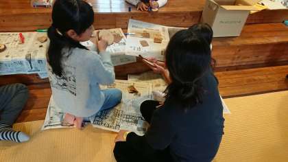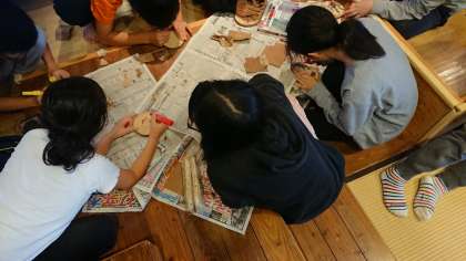 ひのきの板の表面を磨き、川場にちなんだ絵を描いています。