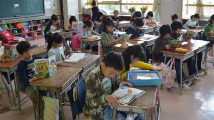 20日(水)、朝の読書タイムの様子です。本校では毎週水曜日の朝は「読書タイム」に設定して、個人の読書、または、保護者の方による読み聞かせを行っています。朝のひととき、どのクラスでもみんなが思い思いの本を選び、静かに読書していました。写真は上から2年、4年、5年です。