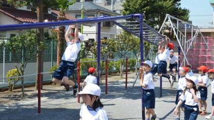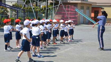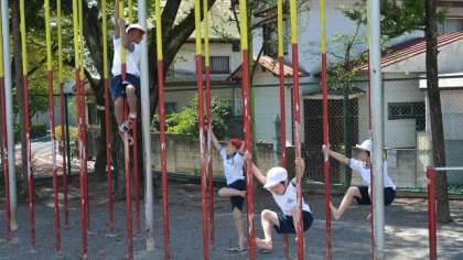 20日、2時間目、1年生の体育です。入学式から2週間でもう一人前の1年生です。整列や体操もきちんとできます。この時間では基本の動きを主に行い、最後はのぼり棒やうんていにチャレンジしました。さすがにこれは苦手な子と得意な子がわかれ、できる子どもは得意げにはりきって活動しています。苦手な子はそれを見て、「すごいねえ」「あんなこともできるよ」と相手のよいところを認めています。こういう気持ちが育っているところがすてきです。さあ、次は君たちがチャレンジしてできるようになるのが目標です。きっと苦労すると思いますが、クラスの仲間が励ましてくれると思います。それが「希望っ子」たちの伝統ですから。最後はしっかり整理体操をして終わりました。よくできました。