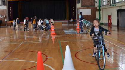 21日、続いて3年生が自転車の乗り方教室を行いました。ご家庭の協力をいただき、子供用自転車を学校にもってきてもらい、それを使って実習をしました。体育館に設定されたコースを、慣れない床の上の走行に戸惑いながらも、慎重に自転車に乗る姿が印象的でした。最近は自転車の事故が急増しているそうです。交通規則をしっかり守って安全に乗りましょう。
