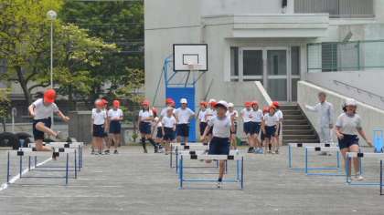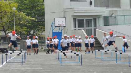 6年の体育、ハードル走の練習の様子です。いつもきびきびした動きをする6年生。特に体育の時は整列や準備が素早く、説明を聞くときも真剣です。各自が目標をもって、工夫しながら跳んでいました。今シーズンはまだ始めたばかりなので、まだ高く跳びすぎたり、踏切位置が近すぎたりと、改良の余地がありそうです。担任の一人一人へのアドバイスで、これからどんどん上達しそうですね。
