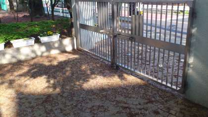25日朝日、正門前のようすです。サクラの花のもとの部分、花柄が地面一面に散らばっています。土曜日の風雨でこのようになったのでしょう。このあと学校主事が子どもの登校前にそうじしました。