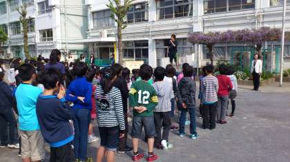 25日、全校朝会のようすです。朝から気持ちのよい天気で、みんな姿勢よくしっかりと話が聞けました。