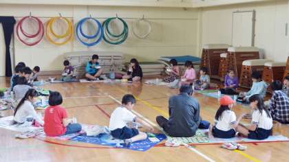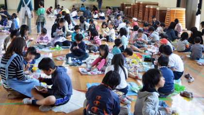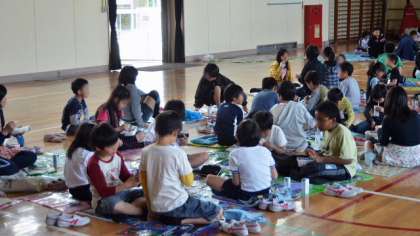 4時間目のゲーム集会の後は「希望っ子班給食」です。各自がお弁当箱を持ってきて、教室で給食をつめて、体育館に集まり、各班思い思いの場所に集まって食べました。こうやって食べると給食の味が、いつもと違った味に感じられるようです。