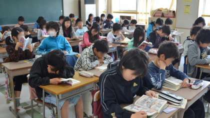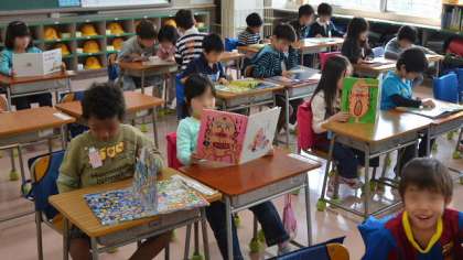 毎週水曜日の朝は読書タイムになっています。写真は1年と6年のようすです。1年生は絵本を開いて楽しそうに、そして6年生は文学作品を黙々と読んでいました。学年らしい読書の風景ですね。