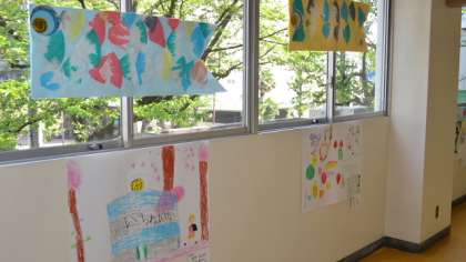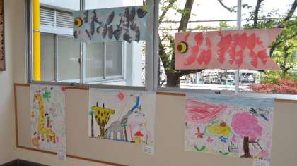 昨年から引き続き、2階の東側校舎廊下に図工の作品を掲示しています。写真は1年生の作品です。楽しい雰囲気ですね。ご来校の際に是非ご覧ください。