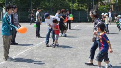 最初の種目は子どもと大人が一緒にする「二人三脚風船割り」です。体を引き寄せあって風船を割るのが大変でした。