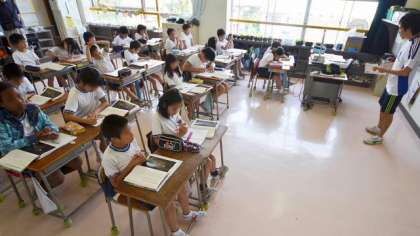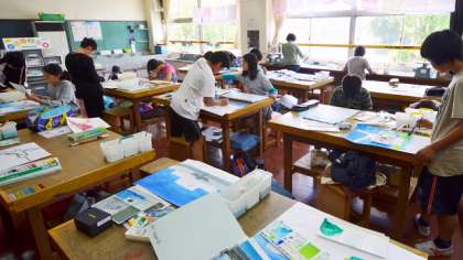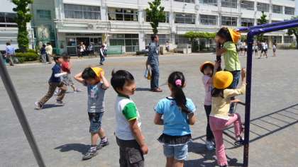 授業参観のようす。上は6年図工です。前の時間からやっていた「世界の行ってみたいところ」の絵の仕上げと、新しい作品「鳥」の絵の下書きをしていました。中は休み時間のようす。天気がよかったので、参観に見えた保護者の方も校庭に出て子どもたちのようすを見ていました。下は4年2組の国語のようすです。説明文の読み取りをするのに、学習課題をクイズ形式にしてわかりやすく説明していました。