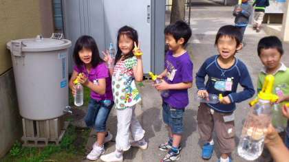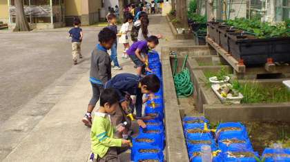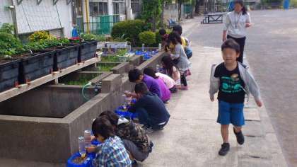 1年生が生活科の学習で育てているアサガオの植木鉢に水やりをしていました。先日種をまいたばかりです。水は体育館のところにある雨水桶(体育館の屋根に降った雨水を貯めて再利用)から自分の容器に入れています。こんな小さな努力からエコの気持ちが育ちます。